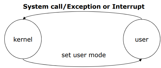 - system call / exception / interrupt가 발생하면 하드웨어는 kernel mode로 전환된다.