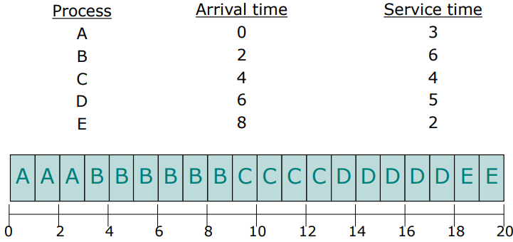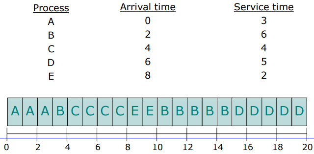 - Turnarround time : A(3 - 0 = 3), B( 9 - 2 = 7), C(13 - 4 = 9), D(20 - 6 = 12), E(15 - 8 = 7)