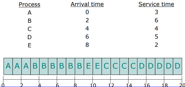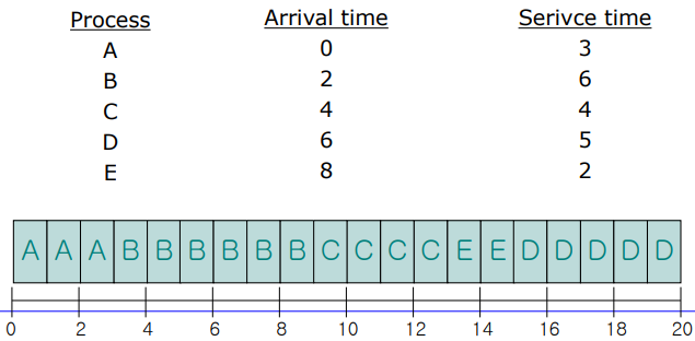 - Turnarround time : A(3 - 0 = 3), B(15 - 2 = 13), C(8 - 4 = 4), D(20 - 6 = 14), E(10 - 8 = 2)