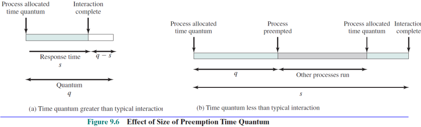 - preempt에 대한 결정은 새 프로세스가 도착했을 때, blocked process를 ready state로 만드는 인터럽트가 발생했을 때 또는 clock interrupt를 기준으로 주기적으로 수행될 수 있다.